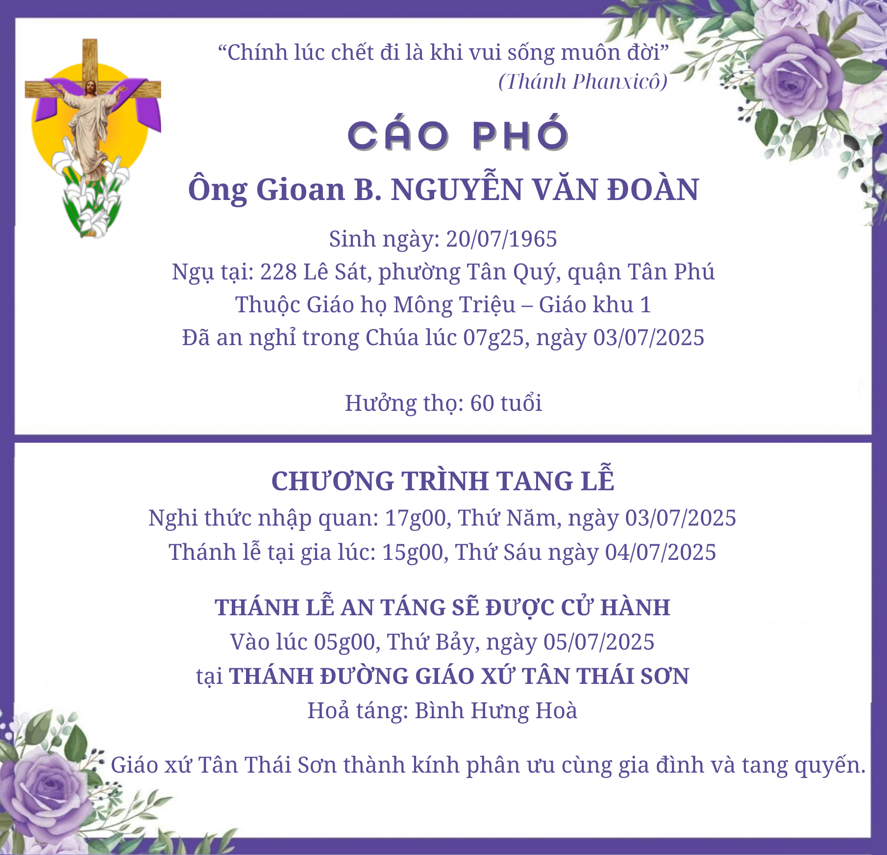 CÁO PHÓ Ông Gioan B. NGUYỄN VĂN ĐOÀNSinh ngày: 20/07/1965Ngụ tại: 228 Lê Sát, phường Tân Quý, quận Tân Phú, Tp.HCMThuộc Giáo họ Mông Triệu – Giáo khu 1 Đã được Chúa gọi về lúc 07g25,…