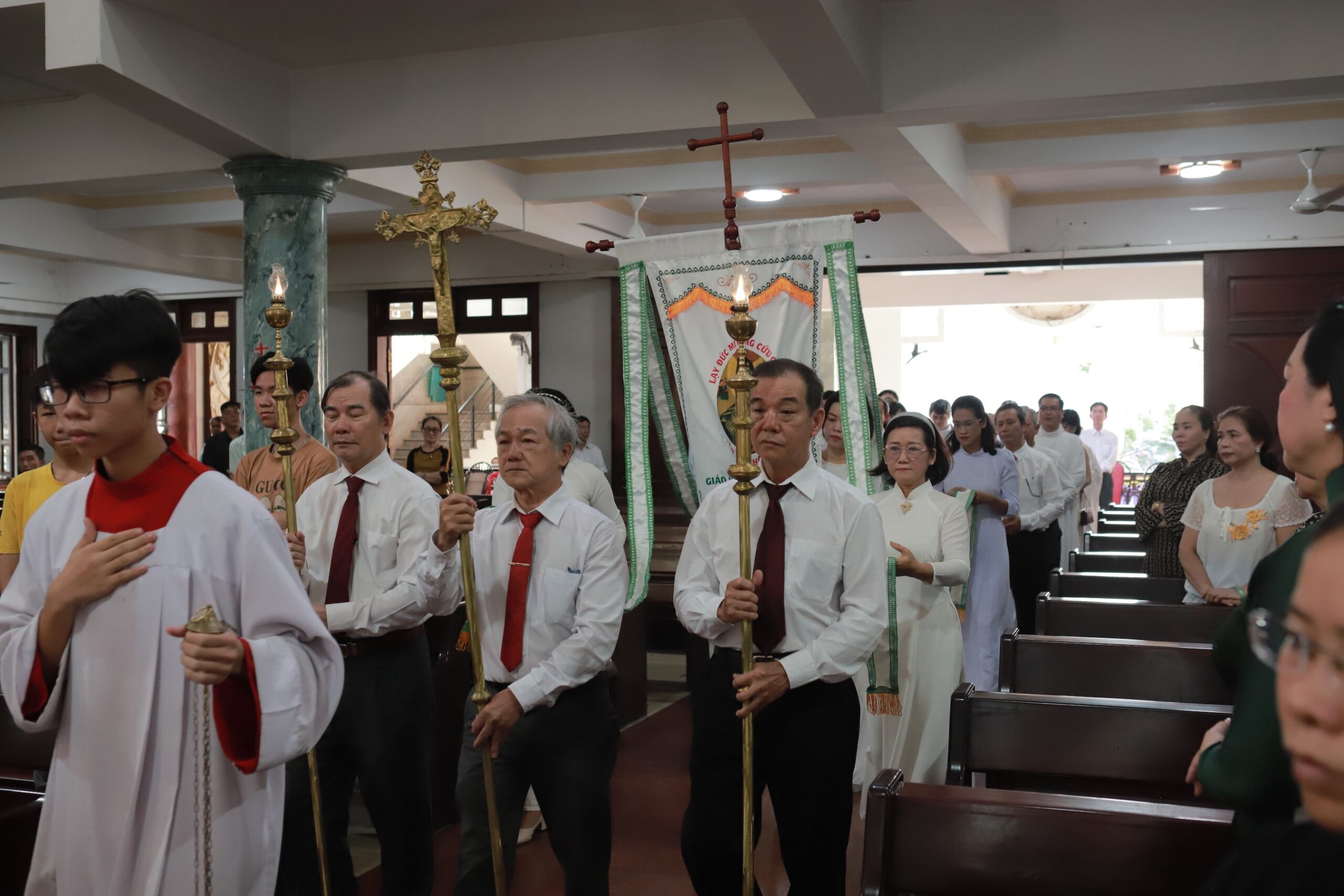 Vào lúc 17g30, đoàn rước long trọng từ cuối nhà thờ tiến lên cung thánh trong tiếng ca tung hô Mẹ Maria, mở đầu cho Thánh lễ trọng thể do Cha chánh xứ Phêrô Lê Hoàng Chương chủ tế. Đồng tế với ngài là Cha phó Gioan Baotixita Trần Nhật Thanh và Cha phó Anrê Nguyễn Công Thái, cùng sự hiện diện của các Soeur, Hội đồng Mục vụ Giáo xứ và đông đảo dân Chúa.Mở đầu Thánh lễ, Cha Phêrô đã gợi lại lịch sử và ý nghĩa của tước hiệu “Đức Mẹ Hằng Cứu Giúp” – danh hiệu được Đức Giáo hoàng Piô IX chính thức tuyên xưng, gắn liền với linh ảnh Byzantine nổi tiếng từ thế kỷ 15, hiện đang được tôn kính tại Đền Thánh Alphonsô, Roma. Qua dòng lịch sử và nhờ các linh mục Dòng Chúa Cứu Thế, lòng sùng kính Đức Mẹ Hằng Cứu Giúp đã lan tỏa khắp thế giới và bén rễ vững vàng tại Việt Nam.Trong phần phụng vụ Lời Chúa, Cha Phêrô đã chia sẻ sâu sắc về linh ảnh Đức Mẹ Hằng Cứu Giúp – một biểu tượng đức tin chứa đựng nhiều tầng ý nghĩa thiêng liêng. Ngài mời gọi cộng đoàn chiêm ngắm từng chi tiết trong bức ảnh để khám phá tình yêu và lòng thương xót vô biên của Thiên Chúa được thể hiện qua Mẹ Maria và Hài Nhi Giêsu.