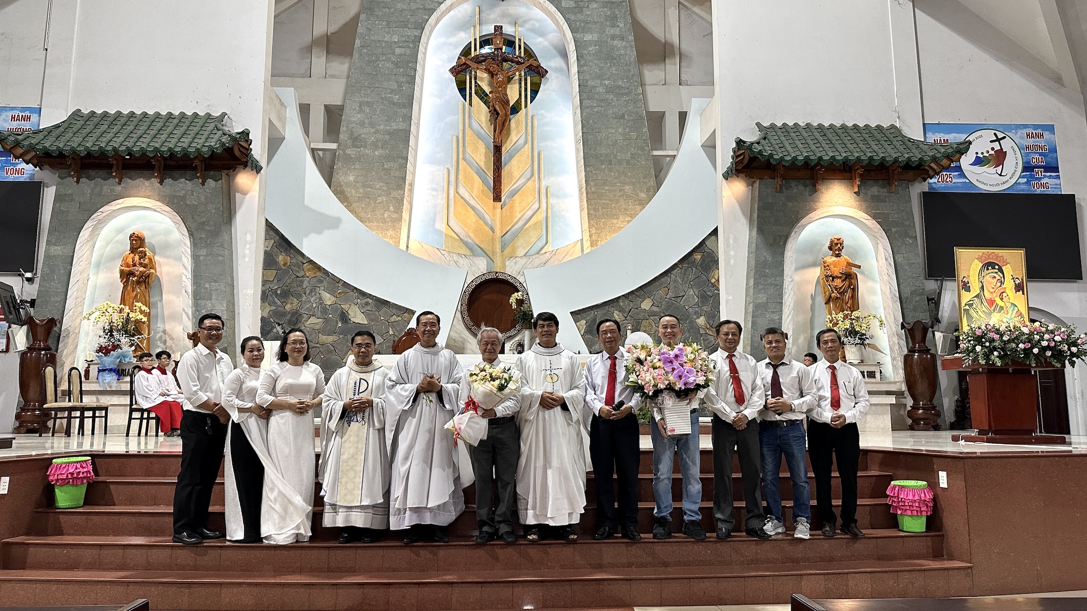 Trước khi kết thúc Thánh lễ, ông Đaminh Hà Mạnh Hùng – Chủ tịch Hội đồng Mục vụ Giáo xứ – đã đại diện cộng đoàn chúc mừng Cha Phêrô nhân dịp kỷ niệm 26 năm linh mục. Một bó hoa tươi thắm được trân trọng dâng lên như biểu tượng của lòng biết ơn, yêu mến.