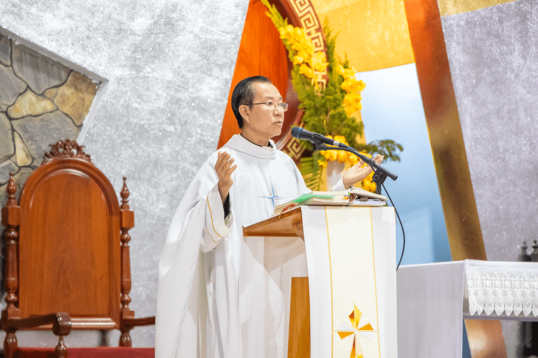 Trong phần Phụng vụ Lời Chúa, Cha Phêrô công bố Tin Mừng Chúa Giêsu Kitô theo thánh Luca (Lc 2,16-21).