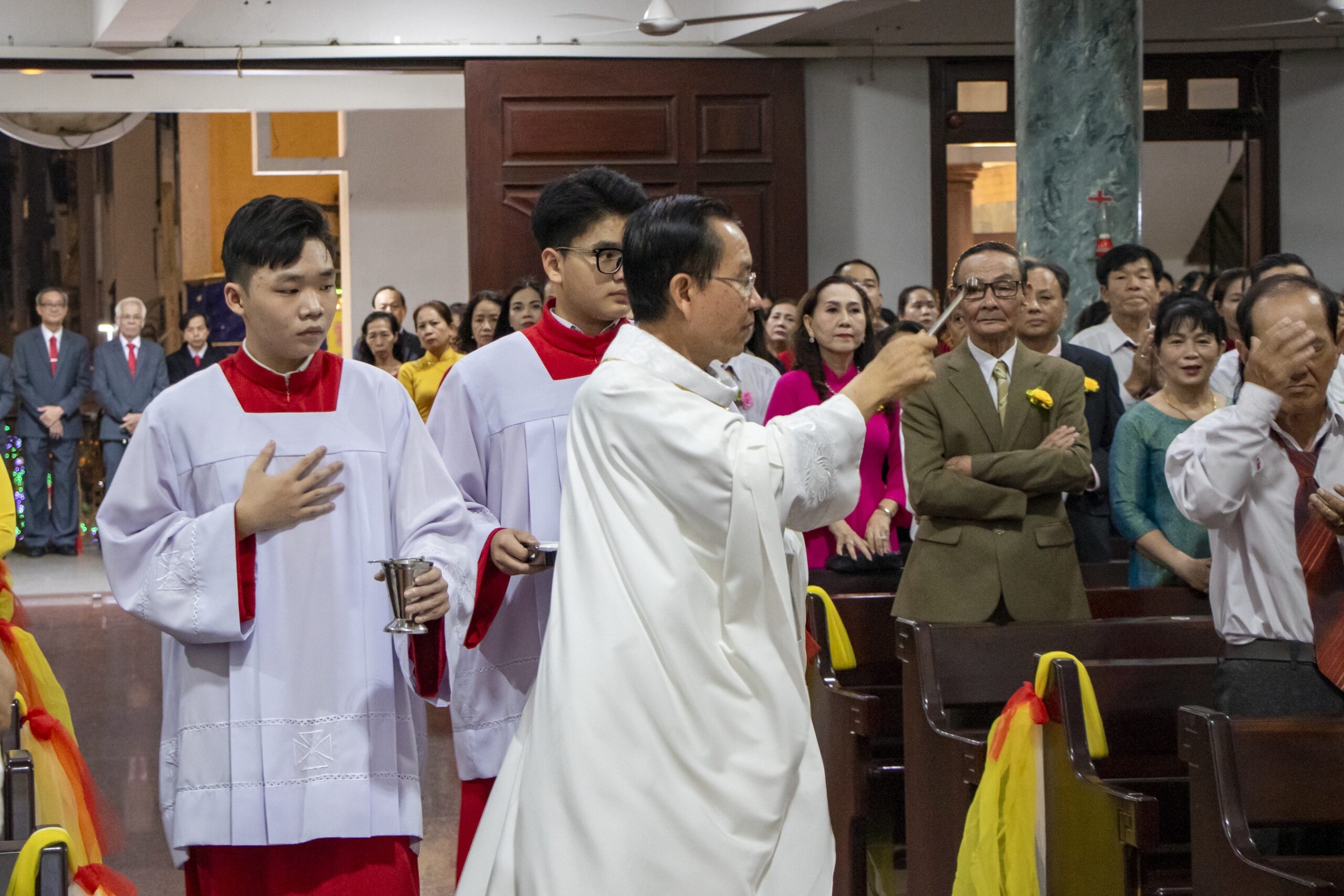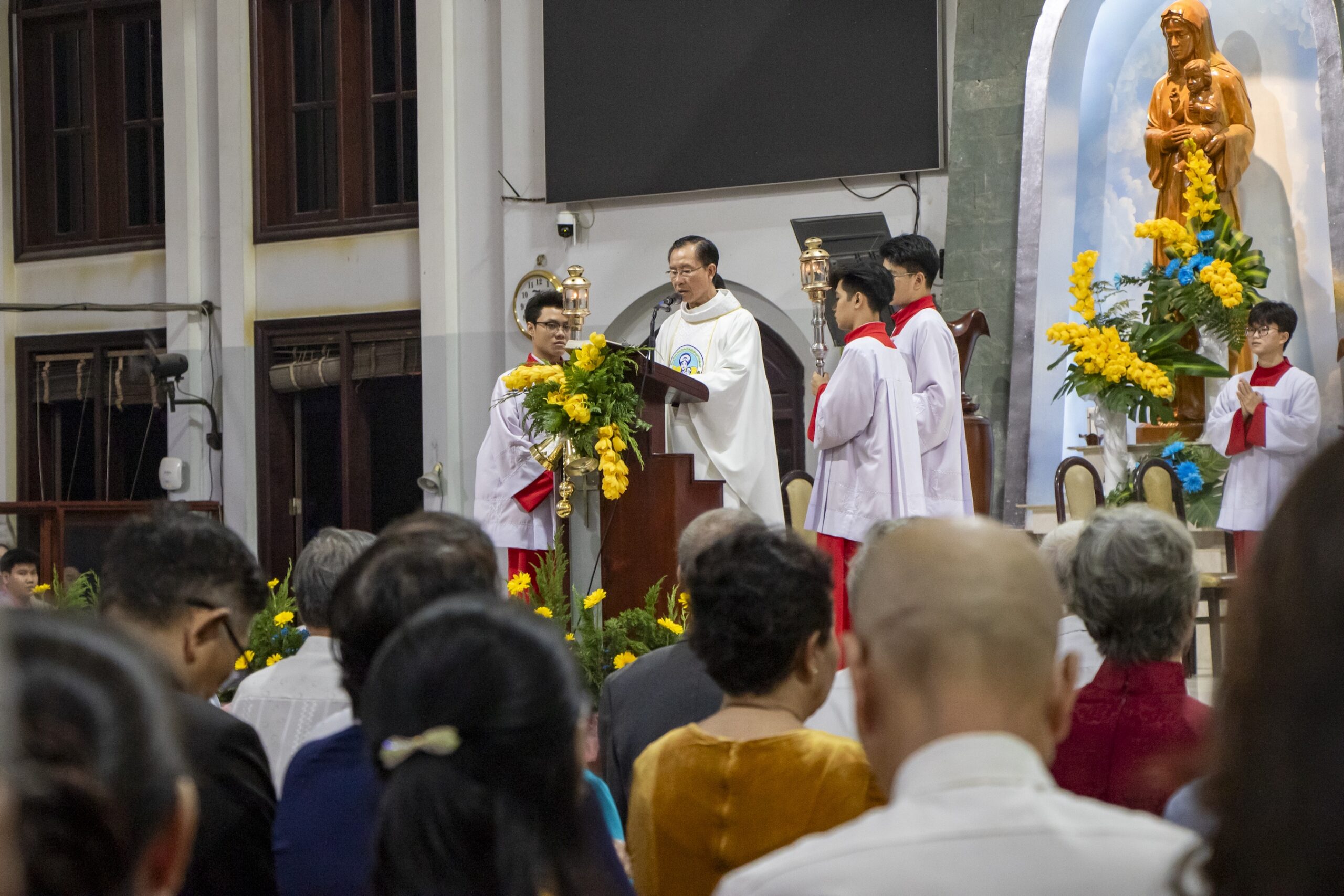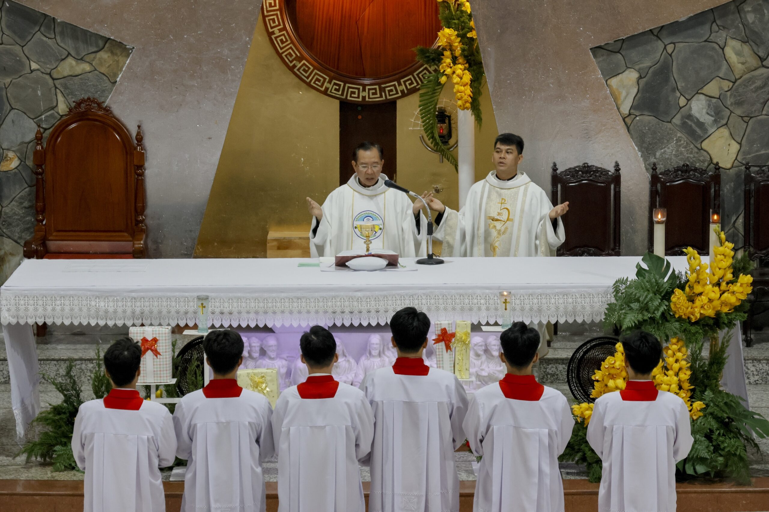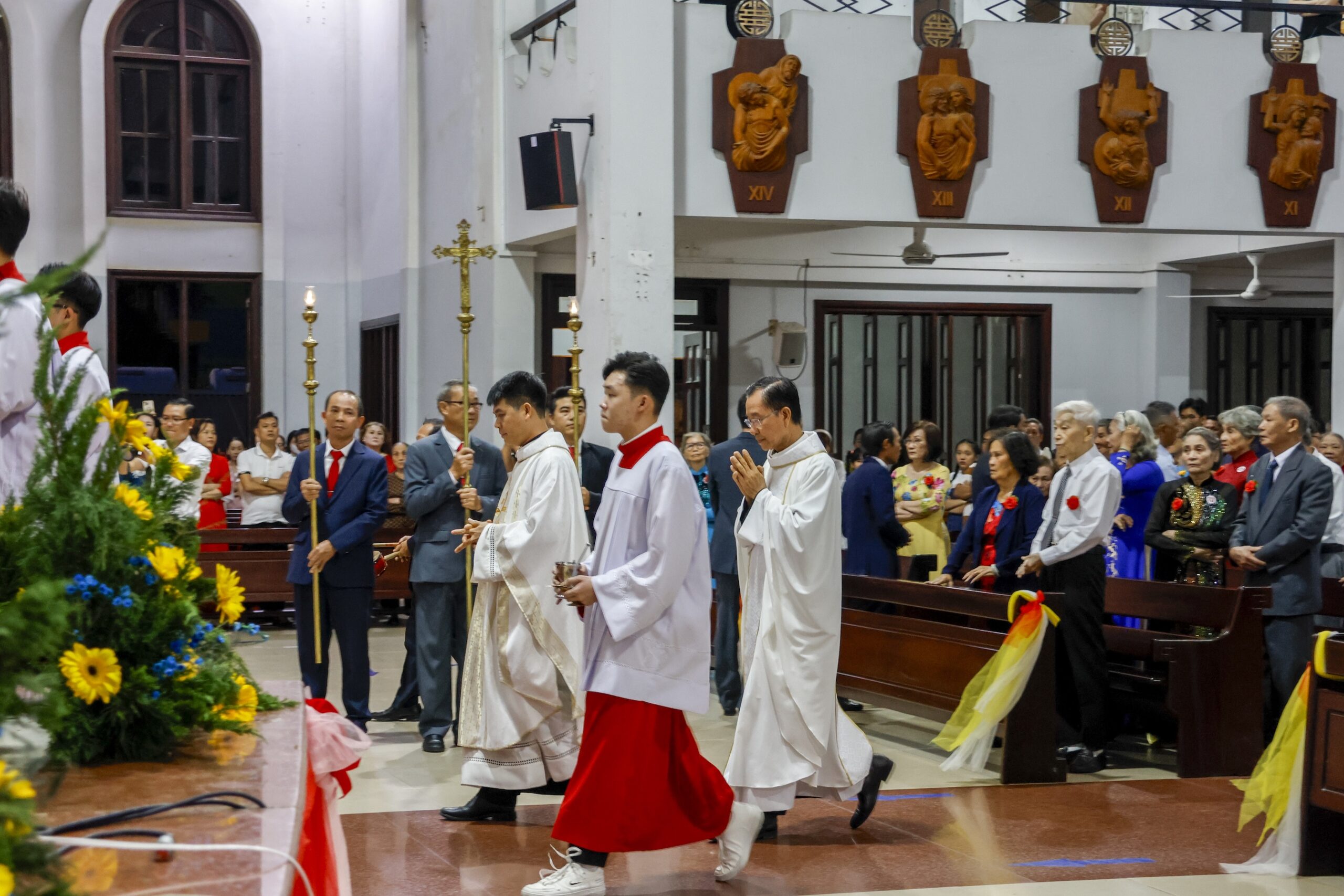 Thánh lễ do cha Phêrô Lê Hoàng Chương chủ sự; đồng tế với ngài có cha Gioan Baotixita Trần Nhật Thanh. Hiệp dâng Thánh lễ còn có sự hiện diện của Hội đồng Mục vụ Giáo xứ, Ban Thường vụ, quý Soeur, cùng đông đảo cộng đoàn dân Chúa, cách riêng là các cặp đôi hôn phối về tham dự và tạ ơn Chúa.