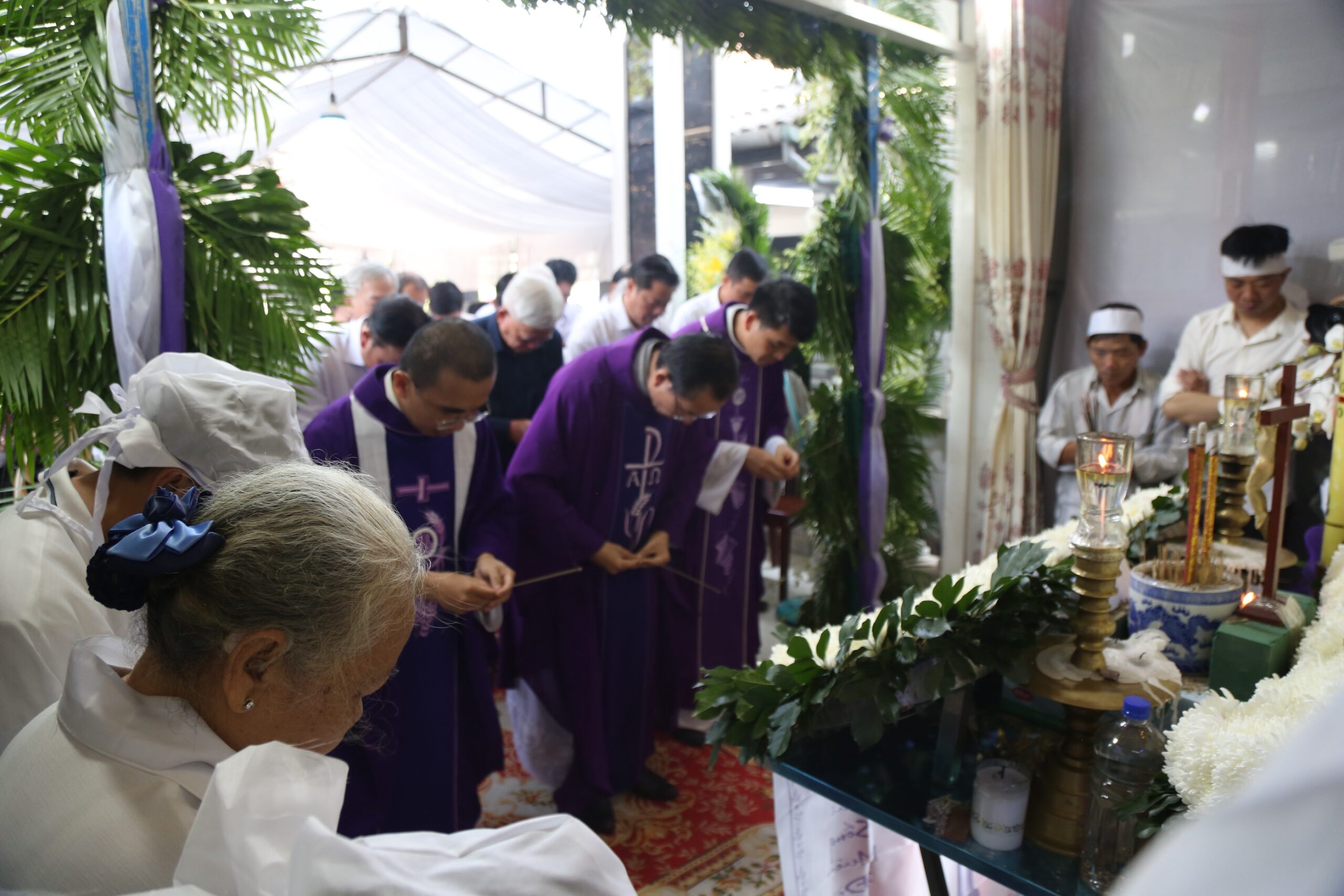 Sau phép lành cuối lễ của Cha Phêrô, Cha Gioan Baotixita cùng Hội đồng Mục vụ giáo xứ tiến lên thắp hương, rảy nước thánh và tiễn biệt Ông Cố Phaolô. Tiếp đến là quý Soeur, các hội đoàn và toàn thể giáo dân hiện diện.